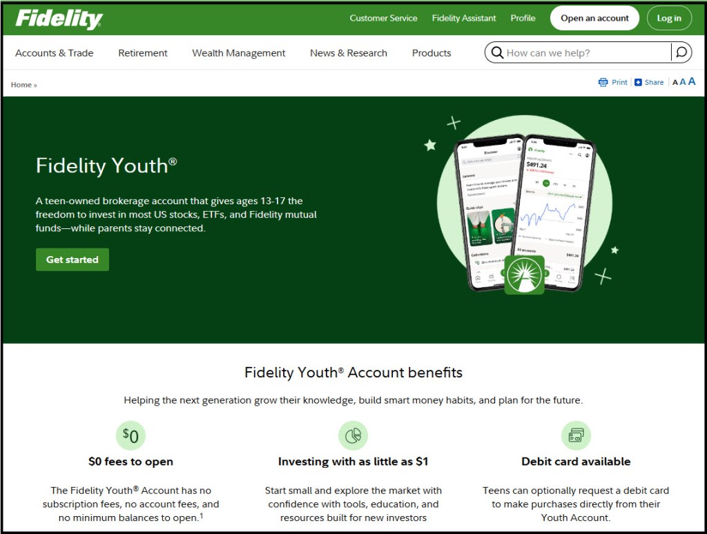 Let’s visit the Fidelity’s Youth Account next. These are designed to help teens between the ages of 13 and 17 learn about financial literacy through hands-on experience. The account was designed to teach responsible spending, saving, and investing behaviors. The account needs to be opened by parents or guardians; however, the ownership and control of the account belong to the teen. Additionally, the teen would be able to request a debit card, should they make their decision with their parent or guardian.