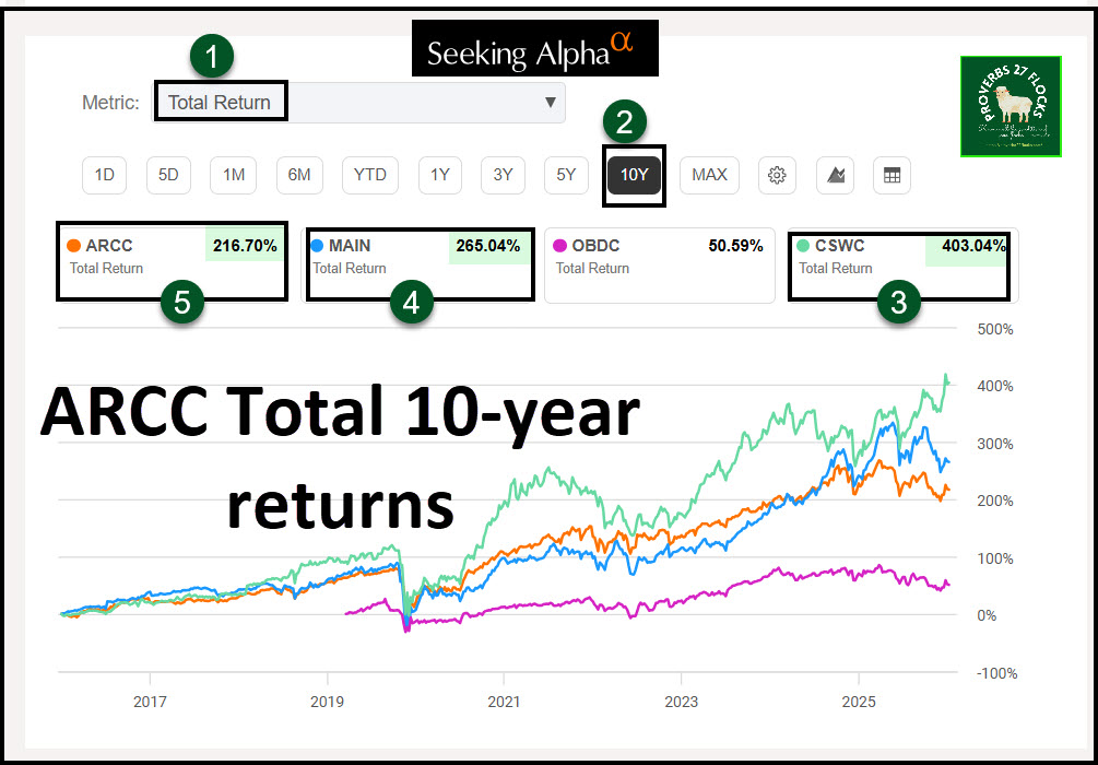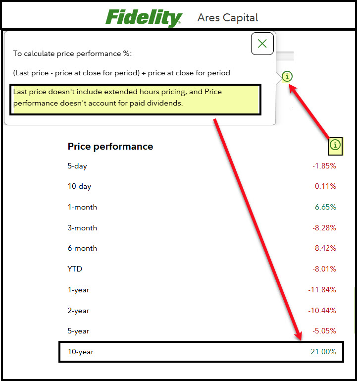 Many investors are clueless about their returns. Fidelity Investments doesn’t help if you look at just the “price performance.” If you look at that on the Fidelity website you will think that ARCC delivered 10-year returns of 21%. If that were the only return, then ARCC is a terrible investment.