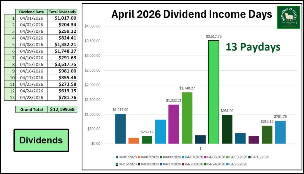 Although the month isn’t over yet, there have been thirteen income days from dividends. The total MTD dividends are $12,199. The fifteenth of the month is generally a good one, as some of the stocks that pay a monthly dividend pay on that day of the month. If you remember that April has eight weekend days, then there are only 22 “workdays” in the month, excluding any holidays or vacation days. Therefore, dividend income appeared on more than half of April’s working days.