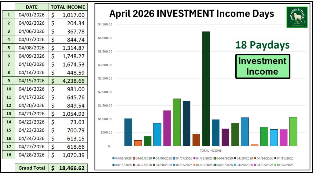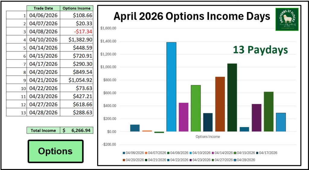 Again, although the month isn’t over yet, there have been thirteen income days from options trades. Most of those have been covered call options, but I have also done some cash covered put options. The total MTD options premiums are $6,267. Again, because April has eight weekend days, then there are only 22 “workdays” in the month. Therefore, option income appeared on more than half of April’s working days. Note that this required a bit of work, but nowhere near even eight hours for the entire month.